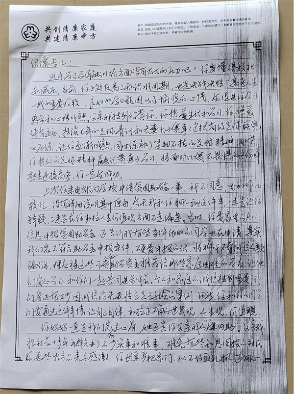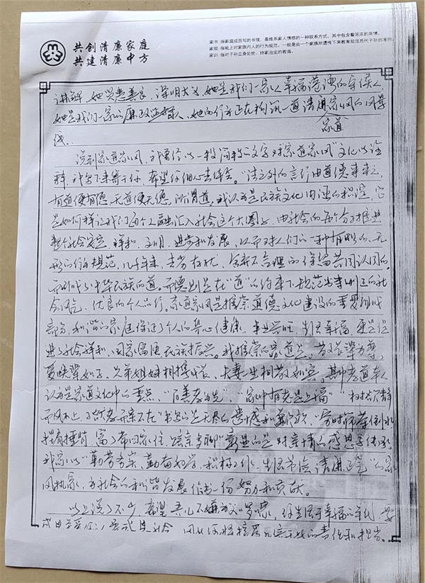 你妈妈一直是我们家的主心骨,她还是你父亲我的“廉内助”。父亲我担任村长十多年,为群众办了不少实事和难事,难免有些知恩图报的村民会送些农产品表示感谢,你母亲严把家门,从不收取礼物,还会细心解说。她贤惠善良,深明大义,她是我们一家人幸福港湾的守护人,她是我们一家的廉政监督人,她的行为正在构筑一道清廉家道家风的风景线。