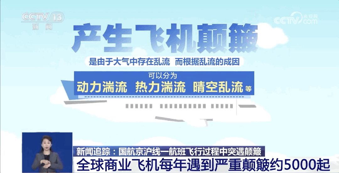 飞机颠簸按照等级通常分为轻度颠簸、中度颠簸和强颠簸。根据国际航空运输协会统计,近年来世界范围内商业飞机遇到的严重颠簸,每年约5000起。