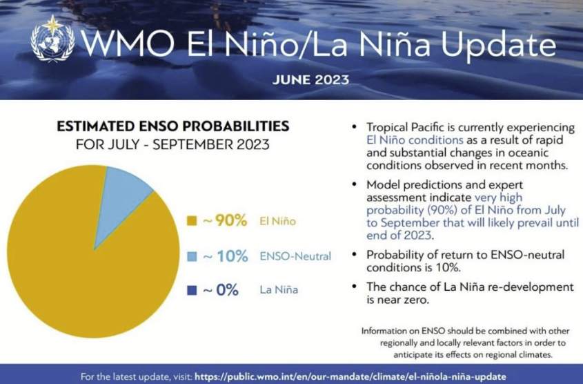 根据世界多地的模型预测和专家评估意见,预计2023年7月到9月间出现厄尔尼诺事件并持续到年底的可能性为90%。(图片来自于世界气象组织)