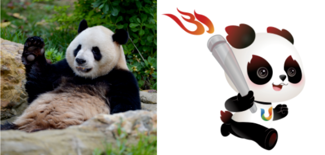 △成都大运会吉祥物“蓉宝”(右图)及其原型熊猫“芝麻”