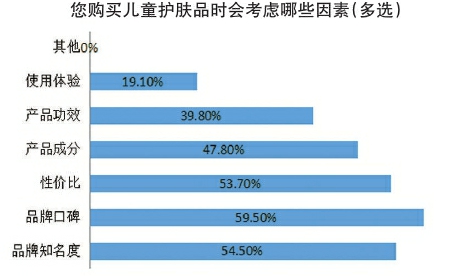 消费者在购买儿童护肤品时更关注什么因素?调查结果显示,消费者在购买时会做多方面的细致考量。“品牌口碑”是59.5%家长的首要考虑因素;“品牌知名度”和“性价比”两大因素紧随其后,分别为54.5%和53.7%;对儿童护肤品的成分、功效也保持较高关注,占比分别为47.8%和39.8%。