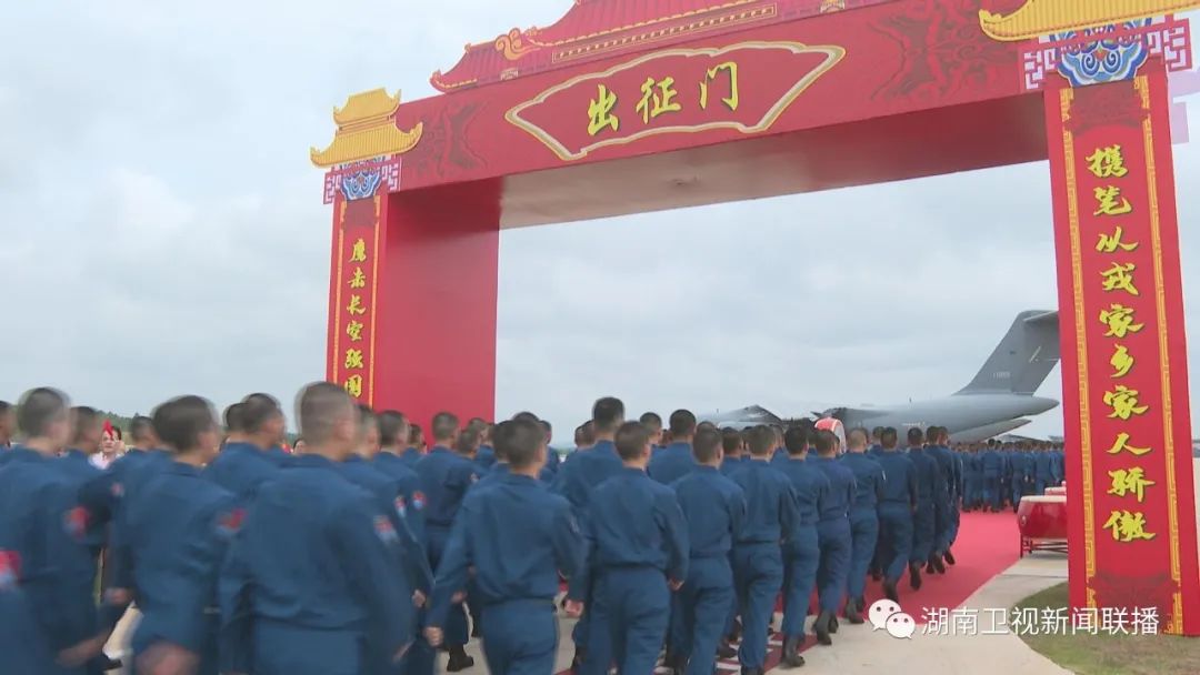激昂的歌声中,中南五省(区)300多名空军新录取飞行学员齐步向前,穿过“出征门”、登上“鲲鹏”运-20飞机,他们将直飞空军航空大学报到,从“青春梦想”直航“逐梦空天”。
