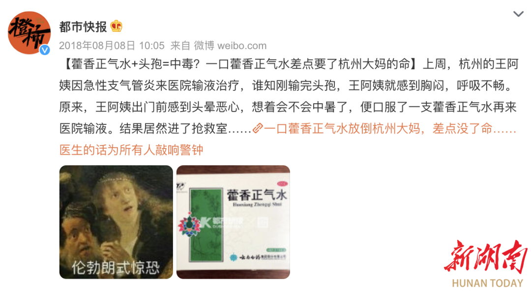 据媒体此前报道,有人连喝2瓶藿香正气水,结果因酒精过敏送急诊。还有人因服用藿香正气水+头孢“中毒”,产生双硫仑样反应转运抢救室。