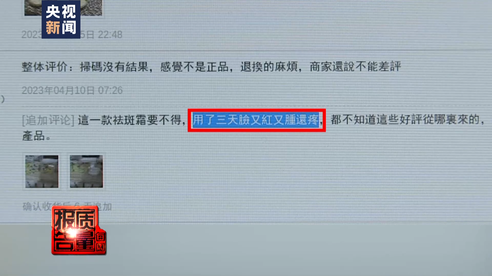 但在随后的调查中,记者发现,消费者的体验并不像商家所宣传的那样让人放心。在这款产品的买家评论中,有消费者反映,收到的产品里有异物;还有买家反映,用了此款产品三天,脸又红又肿还疼。
