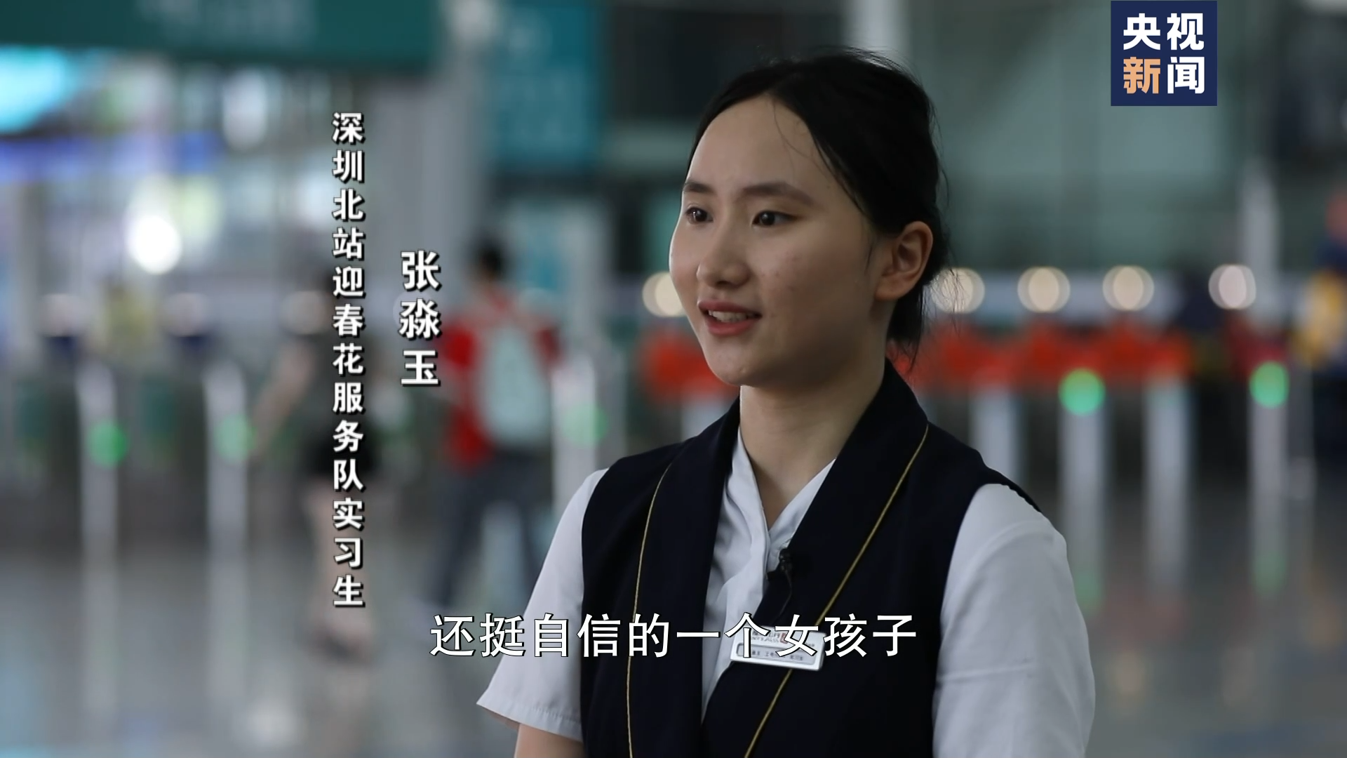 深圳北站迎春花服务队实习生 张淼玉:特有礼貌,我感觉她是一个挺勇敢还挺自信的女孩子。当天是从车厢门口到出站口,再带她坐电梯下去地铁站,不到一公里,走了差不多15到20分钟。