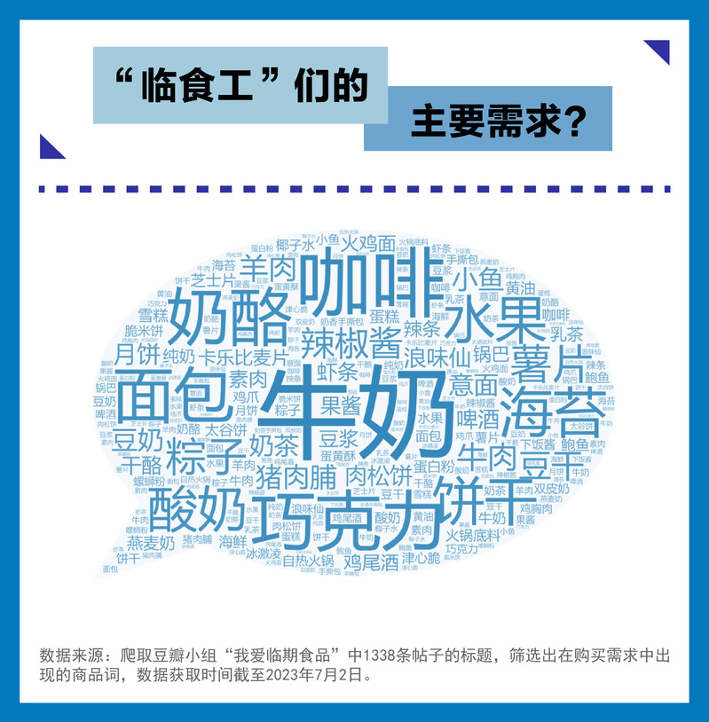 在对“我爱临期食品”组内1338条帖子的标题进行词频统计后我们发现,“临食工”们最大的需求是牛奶、咖啡、面包等可以代餐的“打工人续命食品”。