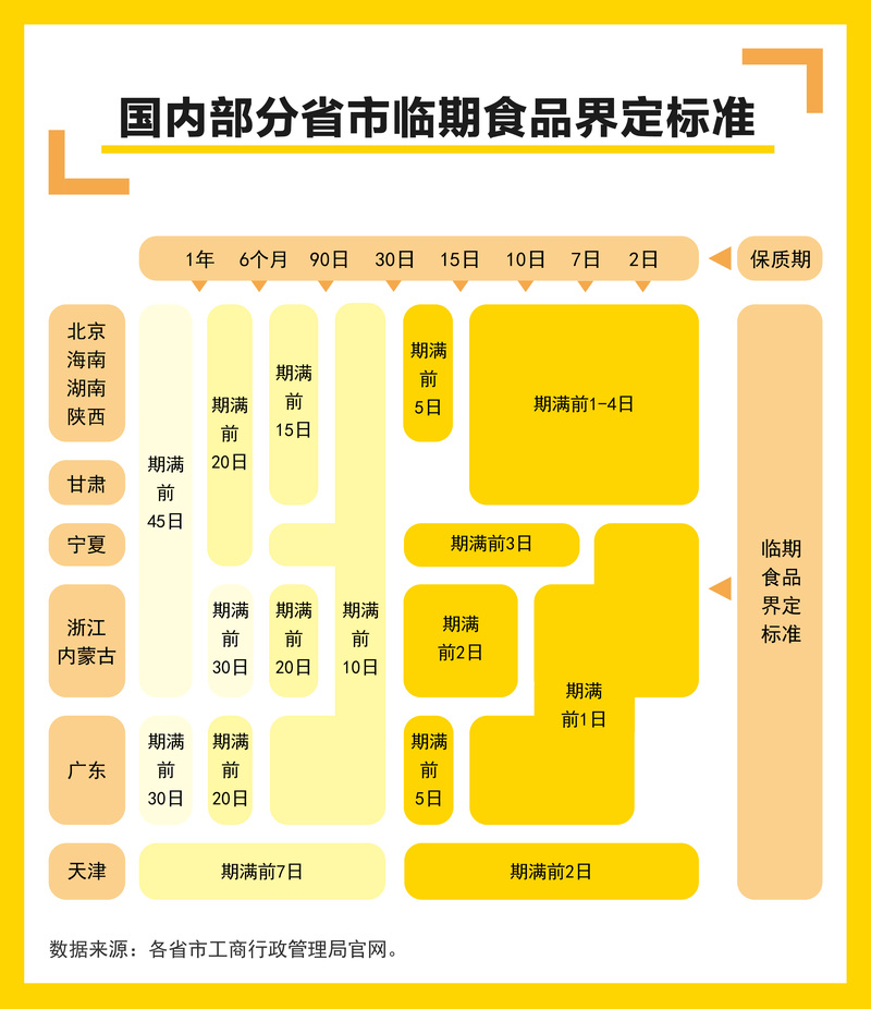 除此之外,大众仍然对于“临期”二字有恐慌、怀疑之感,认为临期食品的口感和质量必然劣于正期,或者认为其有损健康。当前我国对于临期食品也并没有专门的法律法规,现存的相关规定都是基于《食品安全法》《反食品浪费法》而制定的地方性法规。对于临近保质期多久算作临期,各省市之间也有着不同的标准。