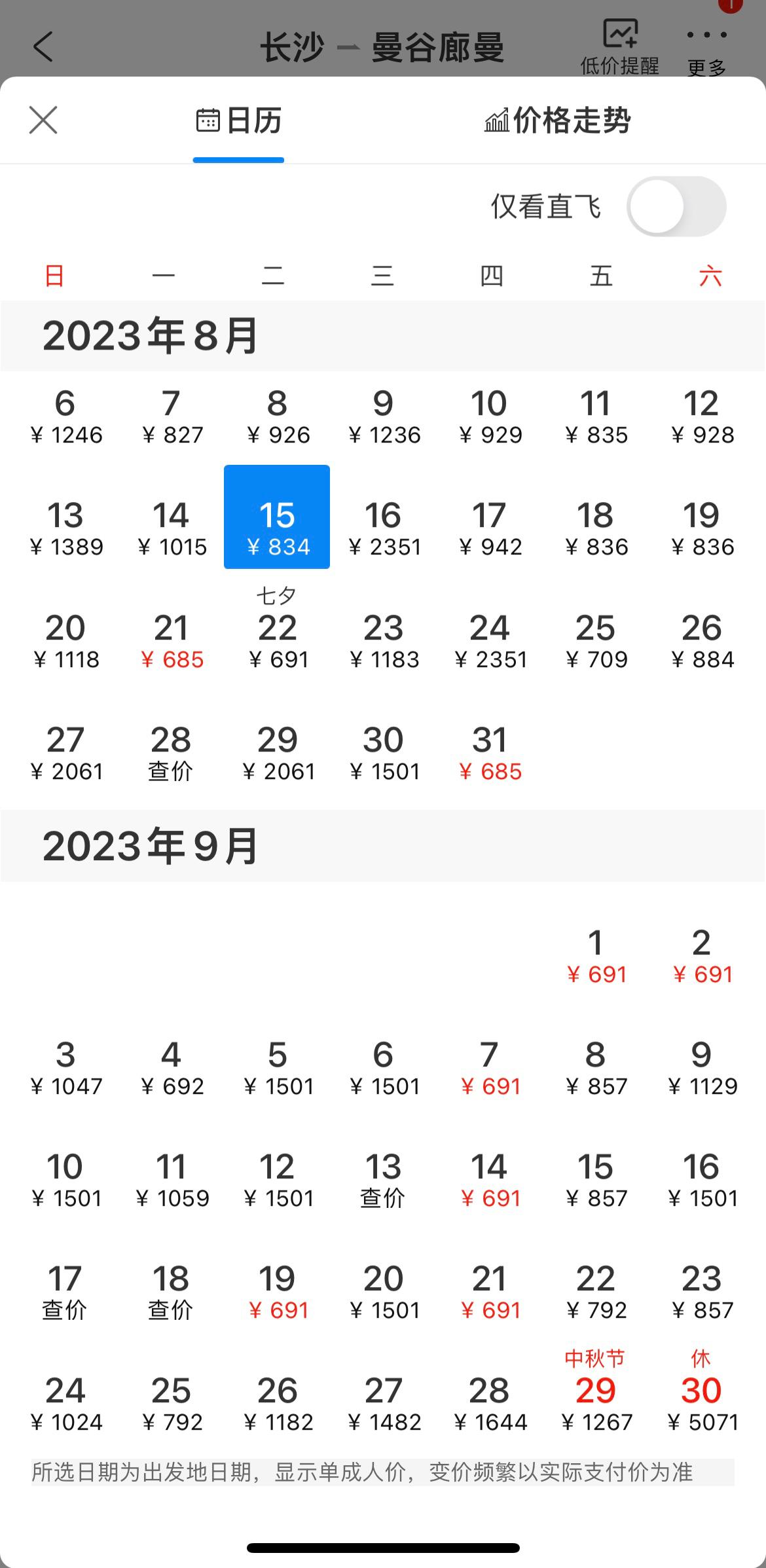 记者登录亚航官网查询,根据价格日历显示,从长沙到泰国曼谷的机票,8、9月份的价格大约在688元至1000元(以下价格均不包含燃油附加费)不等,9月29日开始,价格上涨至1200元-1400元不等。记者通过携程app查询长沙至新加坡的机票价格,8月份的价格从789元至1500元之间浮动,从中秋节开始,机票价格上涨至2500元左右。