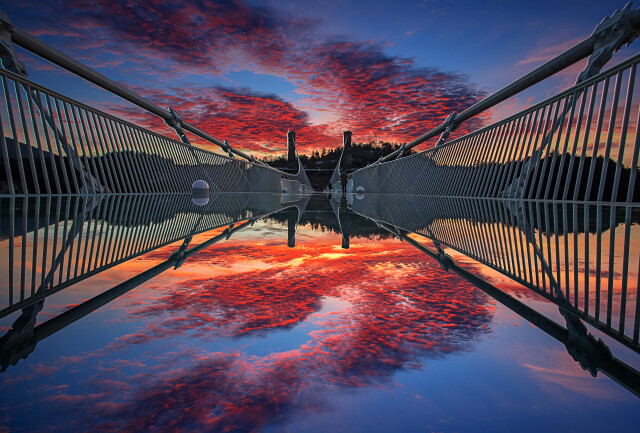 傍晚,太阳的余晖渐尽,峡谷优先进入黑夜,此时,玻璃桥上还倒映着最后一屡霞光。那是日落前,玻璃桥给予夕阳的“双份”回馈。