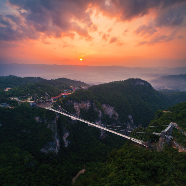 云天渡,原称张家界大峡谷玻璃桥,位于张家界市慈利县三官寺土家族乡境内。每天日落时分,天空染上了绚丽的色彩,晚霞如火焰般燃烧,给人一种无限美好的感受。张家界大峡谷景区气候禀赋优质、生态环境优良、养生资源丰富、康体配套服务完善,于今年获评“湖南省气候康养示范基地”称号。
