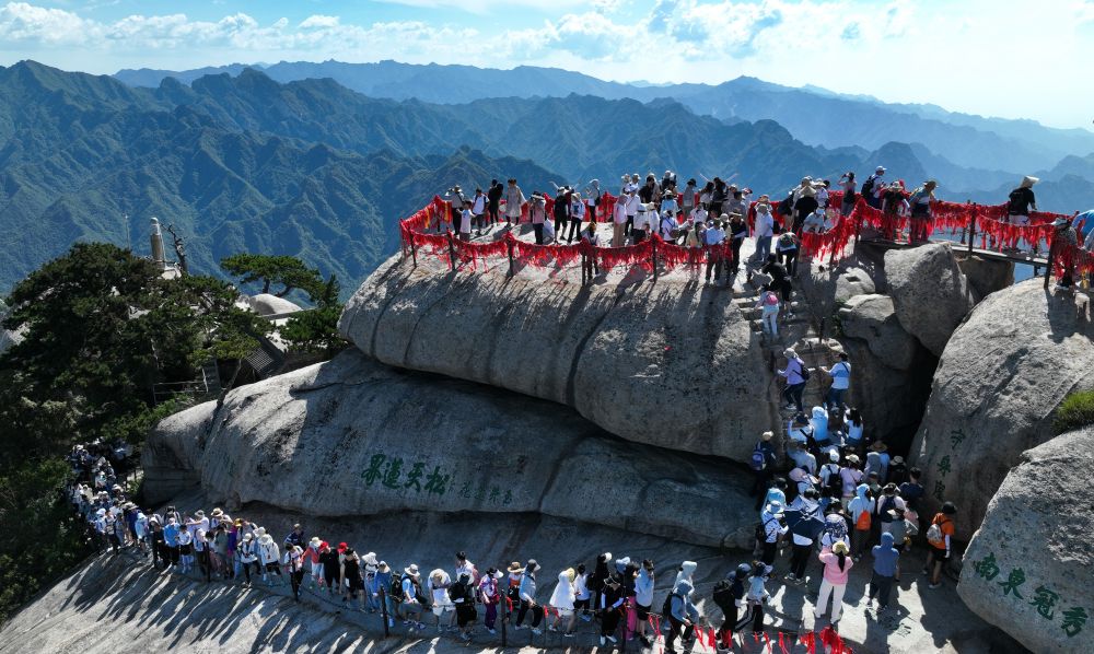 6月23日,游客在华山西峰顶游览(无人机照片)。新华社发(张岚 摄)