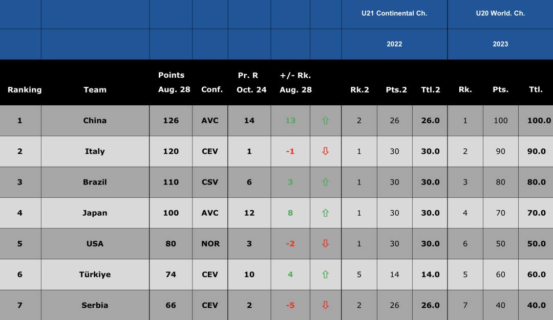 8月28日,国际排联公布了最新的U21女排世界排名。中国队凭借U21女排世锦赛冠军入账100分,排名升至第一,飙升13位。意大利U21女排以120分退居次席,巴西、日本和美国队分列3至5位。