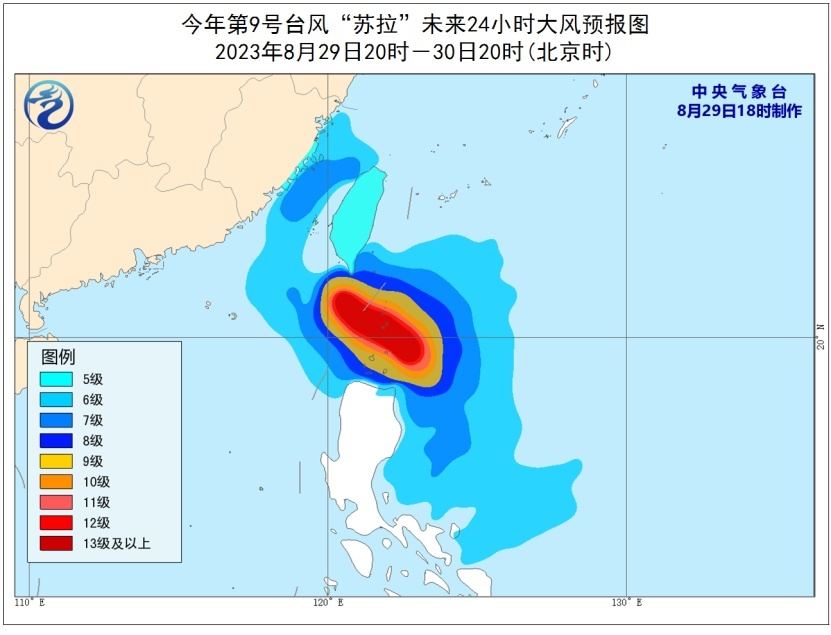 大风预报:8月29日20时至30日20时,巴士海峡、台湾海峡、台湾以东洋面偏南海域、南海东北部的部分海域、福建沿海、台湾岛东南部沿海将有6-8级、阵风9-10级的大风,其中巴士海峡海域风力可达9-10级,部分海域风力可达11-13级,“苏拉”中心经过的附近海面的风力有14-16级、阵风17级及以上,请过往船只注意航行安全。