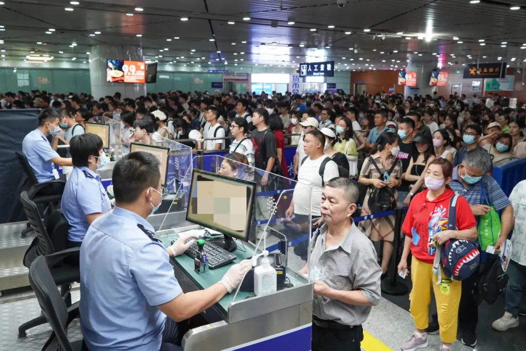 暑期期间,拱北口岸出入境旅客数量达1800万人次,珠海边检总站拱北边检站开足查验通道,保障旅客顺畅通关 。(丁瑞 摄)