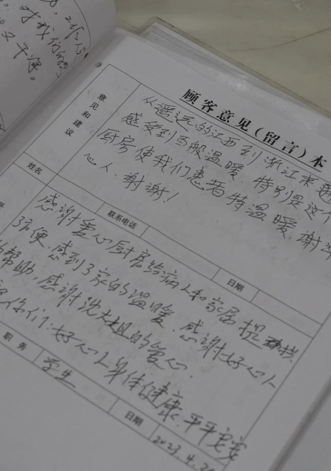 在厨房门口的桌子上,放了一本登记本,全国各地来过的病人家属,都会在上面留下自己的使用记录,从浙江到江西、安徽、福建……最远的病人来自新疆。旁边还有一本留言本,上面写满了病人的“感谢”——