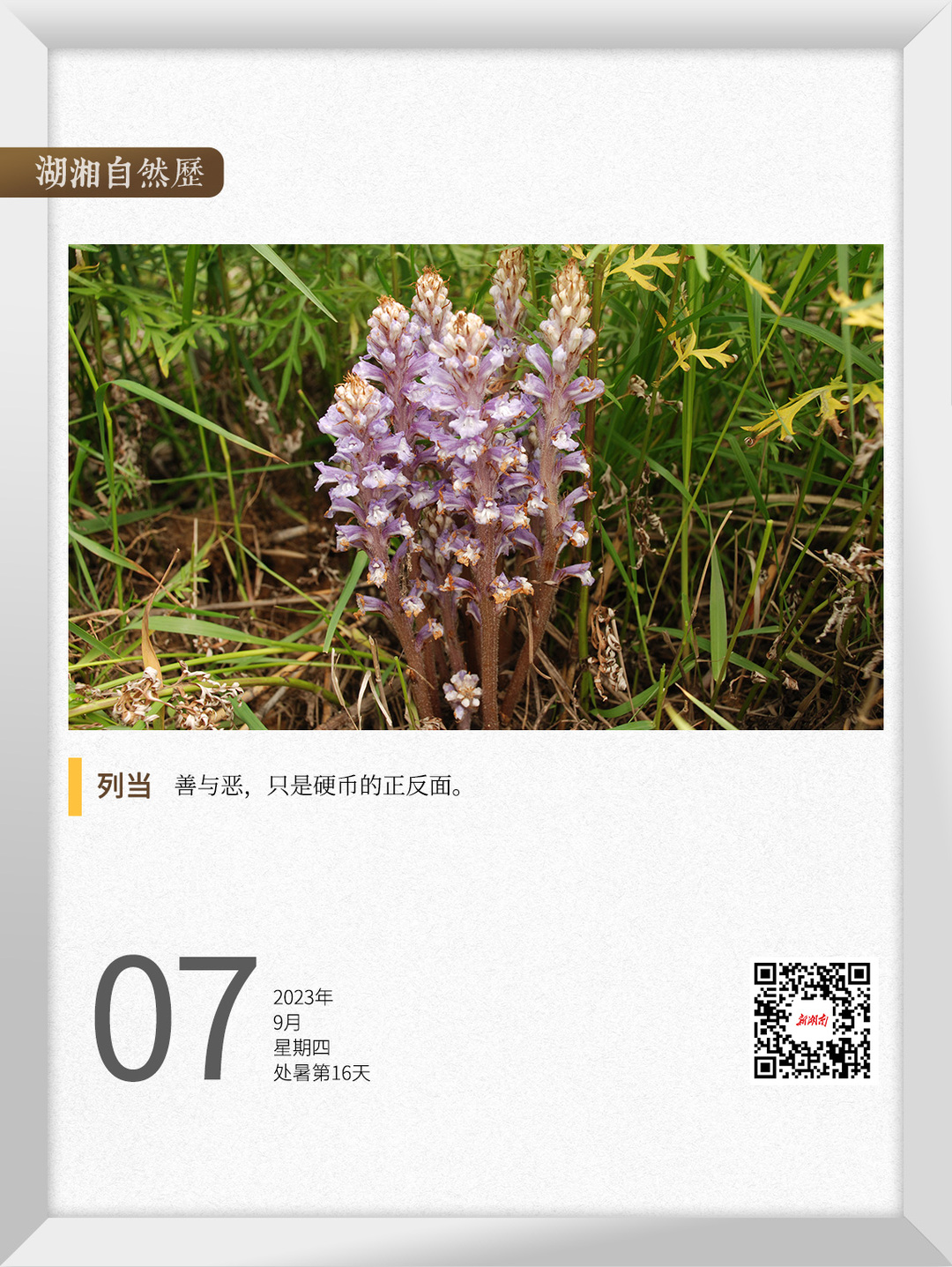 显然,要遇见野生列当,对于湖南人来说已经不容易了。即使幸运碰到,不熟悉其形状的人大概率也会错过。幼嫩时,它们如一小截蛇尾巴,细长而布满鳞片;夏季开出一串蓝或紫色小花,应该是它们一生最美的时候,但也谈不上多亮眼。