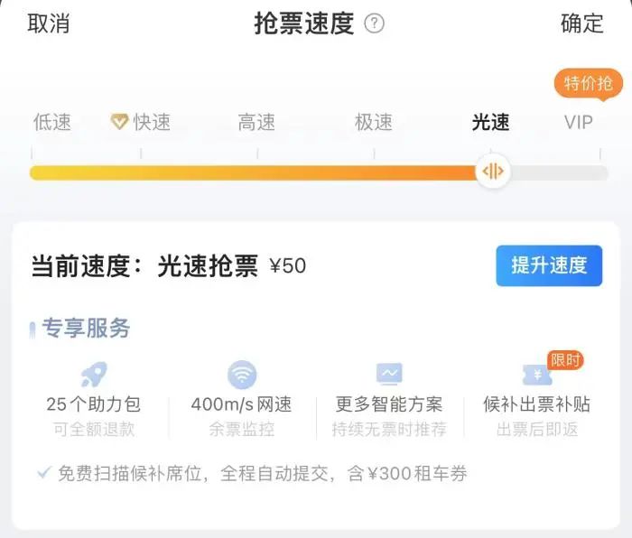 此外,许多第三方平台推出抢票加速服务。例如,某平台实行阶梯服务及价位,速度从快速、高速、极速、光速到VIP,分别提供5-40个“助力包”,网速为200-500m/s,价格从10-80元不等,平台会赠送助力包,也可通过邀请好友获取。该平台还推出专人抢票功能,使用该功能可以24小时不间断、通过更多渠道抢票,提高抢票成功率,价格为30元。此外,抢靠窗、过道的位置需另外加价。