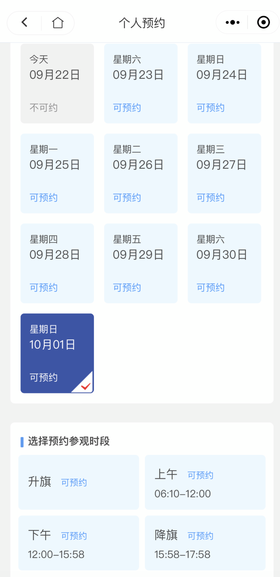 目前。10月1日“升旗”时段的预约已对外开放。记者注意到,今年“升旗”共有“00:00-03:10”、“03:10-04:10”、“04:10-05:10”、“05:10-06:10”这4个时段可供选择。需要注意的是,市民游客还需要再次选择核验地点,方能完成预约。
