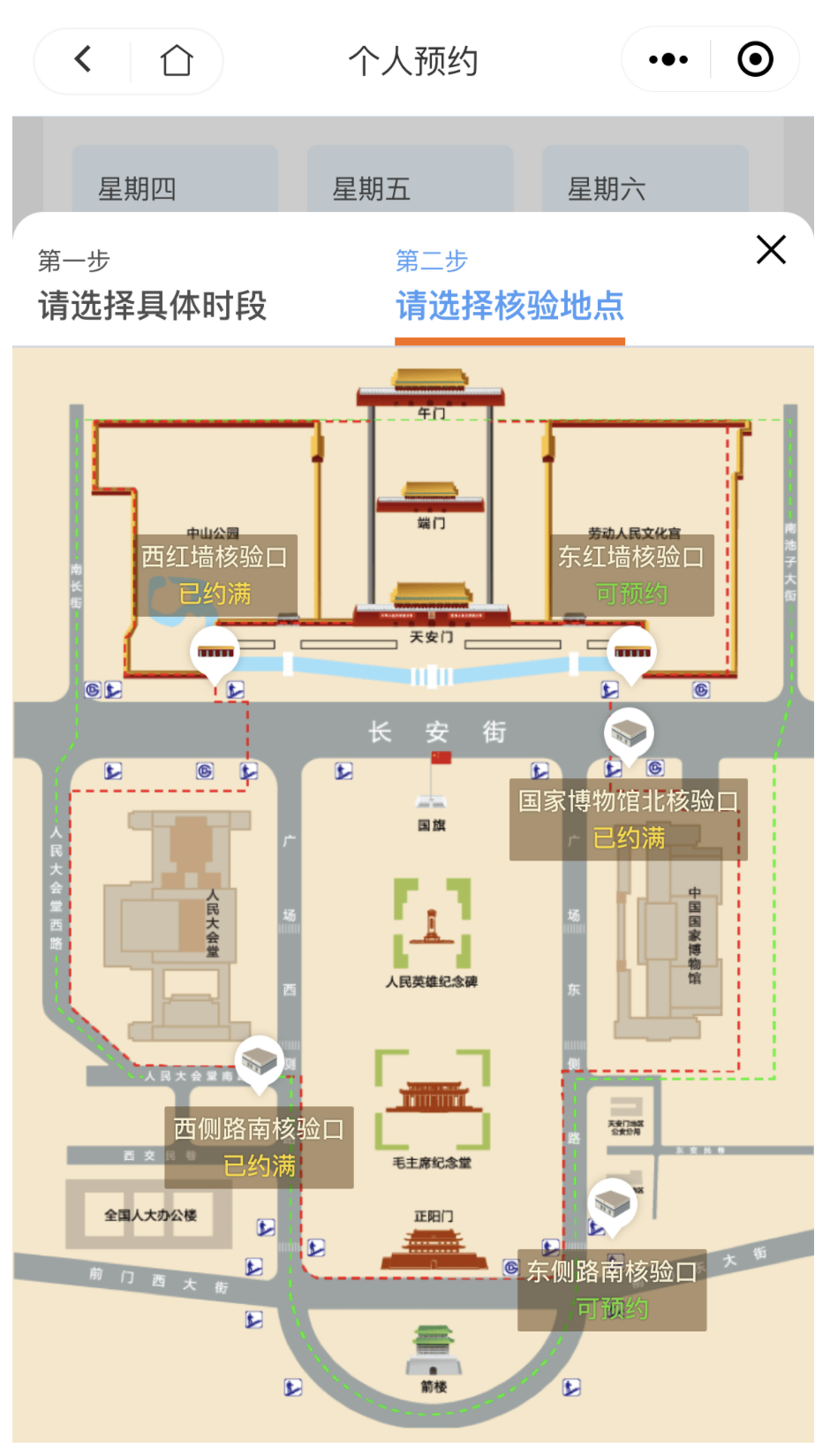 截至目前,“0:00-03:10”时间段,西红墙核验口和国家博物馆北核验口已约满,东红墙核验口、西侧路南核验口、东侧路南核验口尚可预约;“05:10-06:10”时间段,仅剩东红墙核验口和东侧路南核验口可预约,其余3个核验口全约满;其余两个时段各核验口均有富余。