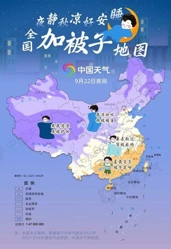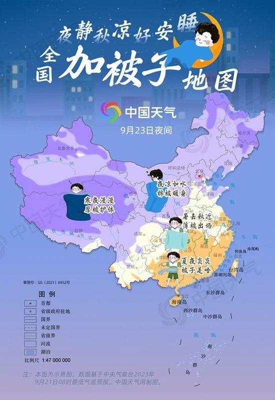 从全国加被子地图可以看出,9月21日至23日,我国北方大部夜间已经凉意明显,需要加被;长江流域一带受冷空气影响,在加和不加被子之间切换;而江南、华南被子依然压箱底。