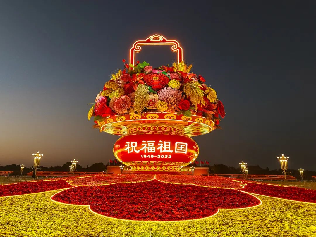 夜幕下“祝福祖国”大花篮同样璀璨夺目~