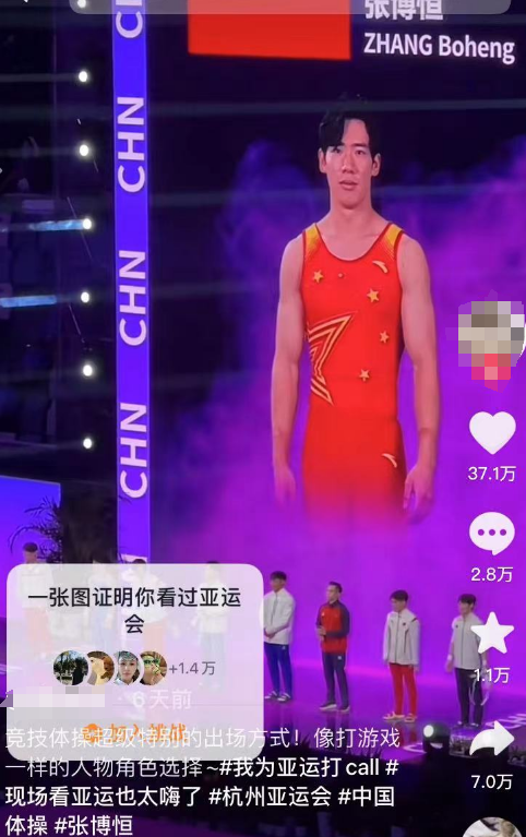 有现场观众分享了一条竞技体操项目中运动员出场的视频,配合灯光、音效,运动员在大屏幕中酷炫转身,摆好pose,这条视频收获网友37万点赞。