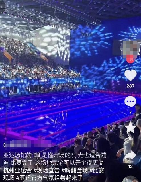 有网友分享亚运会游泳场馆的开场灯光,光束拉满,颜色酷炫。“比赛完了,这场地完全可以开一个夜店”。