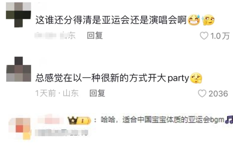 不少网友表示,有了这届气氛组的努力,总感觉在以一种很新的方式开大party,分不清是亚运会还是演唱会,运动员和线上、线下的观众都感受到了亚运会美妙的氛围。