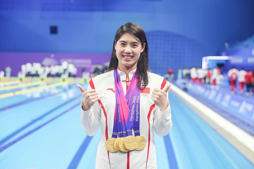 张雨霏在本届杭州亚运会中,一人拿下6枚金牌,覃海洋拿下5金1银。