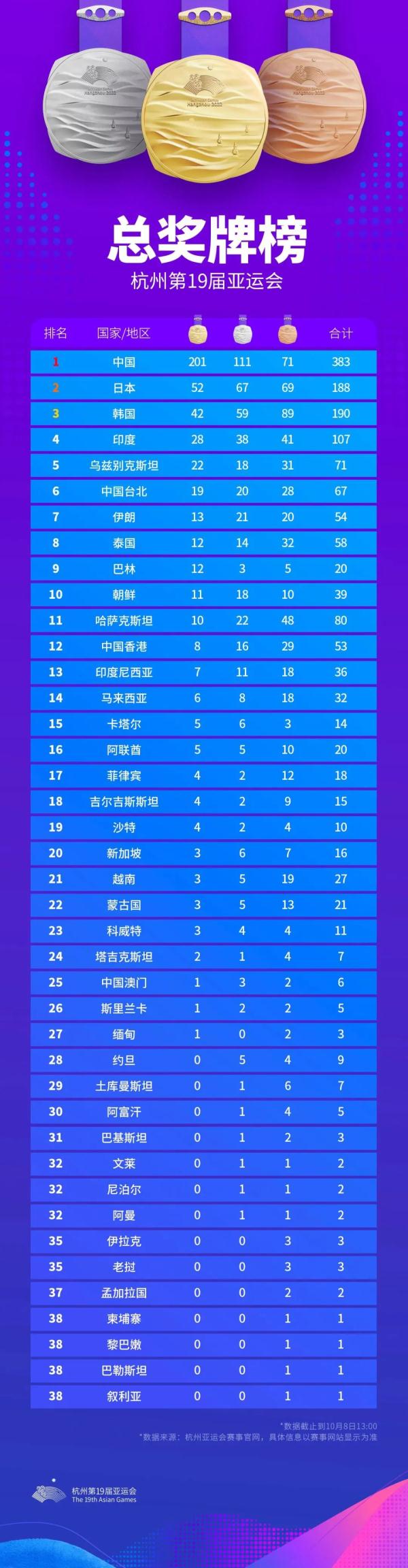 中国体育代表团获得201金111银71铜,共383枚奖牌,取得亚运会参赛历史最好成绩。自1982年第九届亚运会以来,中国体育代表团连续第十一次位居亚运会金牌榜榜首。