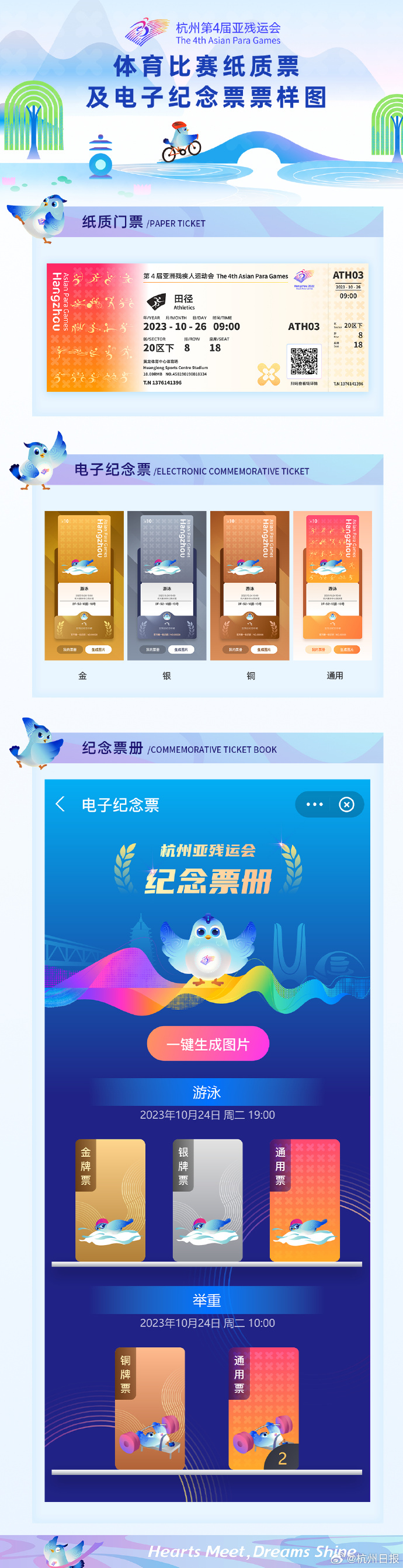 公众可扫描下方二维码进入售票官网购票。竞赛场馆售票亭和官方门票服务网点等线下官方购票渠道将于后续启动并向社会公布。此外,杭州亚残组委还发布了体育比赛纸质票及电子纪念票票样设计图。