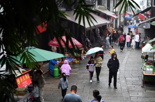 (近日,长沙降温明显,靖港古镇上的行人纷纷穿上了外套。湖南日报全媒体记者 田超 摄)