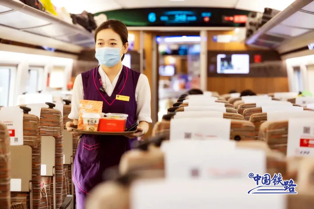 餐服员进入静音车厢,会停止对商品的介绍,如果旅客需要餐饮服务,可“扫一扫”座椅扶手上【铁路畅行码】,按照页面显示进行下单,工作人员会及时送货到座。
