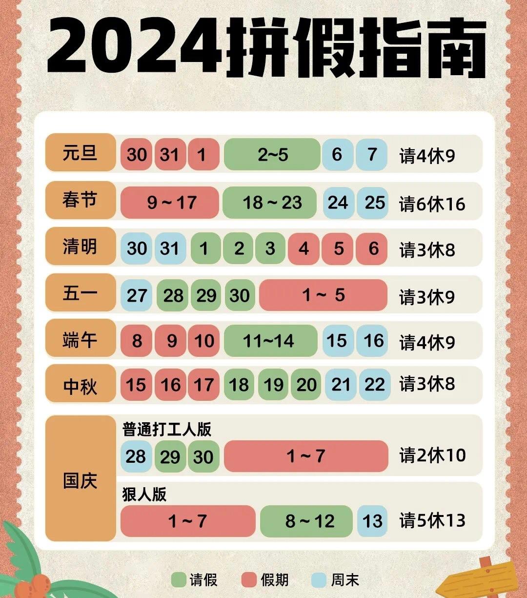 同程研究院相关负责人介绍,相比往年“小长假+黄金周”的放假安排,2024年的假期层次更加丰富,不仅有4个3天的小长假,还有5天、7天甚至9天的“超长黄金周”。此外,随着国内带薪休假制度的落实,拼假已经成为不少年轻人假期出游的重要方式。为方便游客出行,同程旅行发布2024年拼假指南,给游客未来一年的假期出行提供参考。