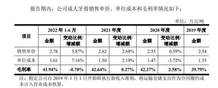 登康口腔旗下拥有冷酸灵等品牌,其招股书显示,2019年至2021年,公司成人牙膏的单位成本分别为1.53元、1.47元以及1.50元。