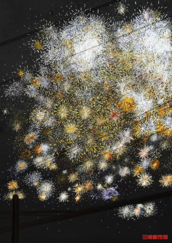 “这个作品一开始做起来并不简单,光是选择绣线的颜色都修改了很多次。”想要绣出烟花的美,色彩的选择极为重要。一开始,他选择了彩色的绣线,但是呈现效果并不佳。画面虽然色彩丰富,但却稍显杂乱。
