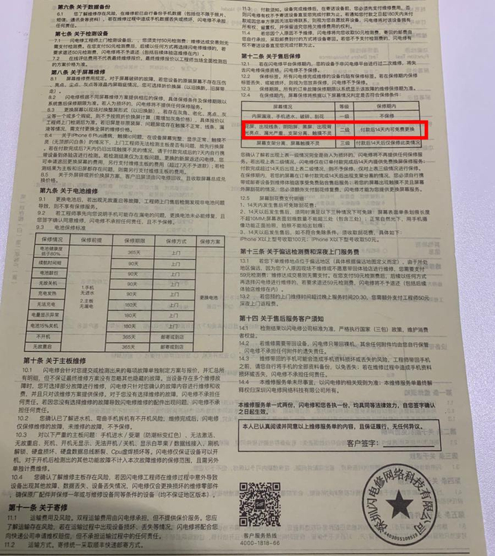 然而,两周后,手机屏幕突然出现了几条黑线。“这部手机我平时都放在家里的,用得不多,也没有机会磕碰,估计是换屏幕引发的问题。”王女士立马联系了闪电修的客服。这时,客服告诉她,这种情况有可能存在,但目前已经超过了2周的保修期,平台无法提供免费的维修服务。“平台上不是宣称一年质保期吗?”王女士想起来,为了避免纠纷,自己当时主动向维修人员索要了维修合同。她找出合同,仔细翻阅发现,里面“第十二条”的确写明,在保修期内,花屏、出现线条、阴阳屏、黑屏、出现背光亮点、漏光严重、支架分离、触摸不良问题的,付款后14天内可免费更换,超过14天后则不予保修。