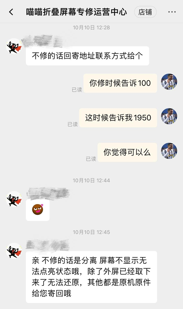 何先生使用的是折叠屏手机,折叠处的外屏因长期使用出现破损,不过并不影响使用。对比了线上和线下的维修价格后,他最终选择淘宝上的一家店铺寄送维修。为了厘清责任,他还特意拍摄了照片、视频记录自己手机的情况,并几次跟淘宝商家确认价格,“商家说外屏价格就100元左右,我这才把手机寄了过去。”