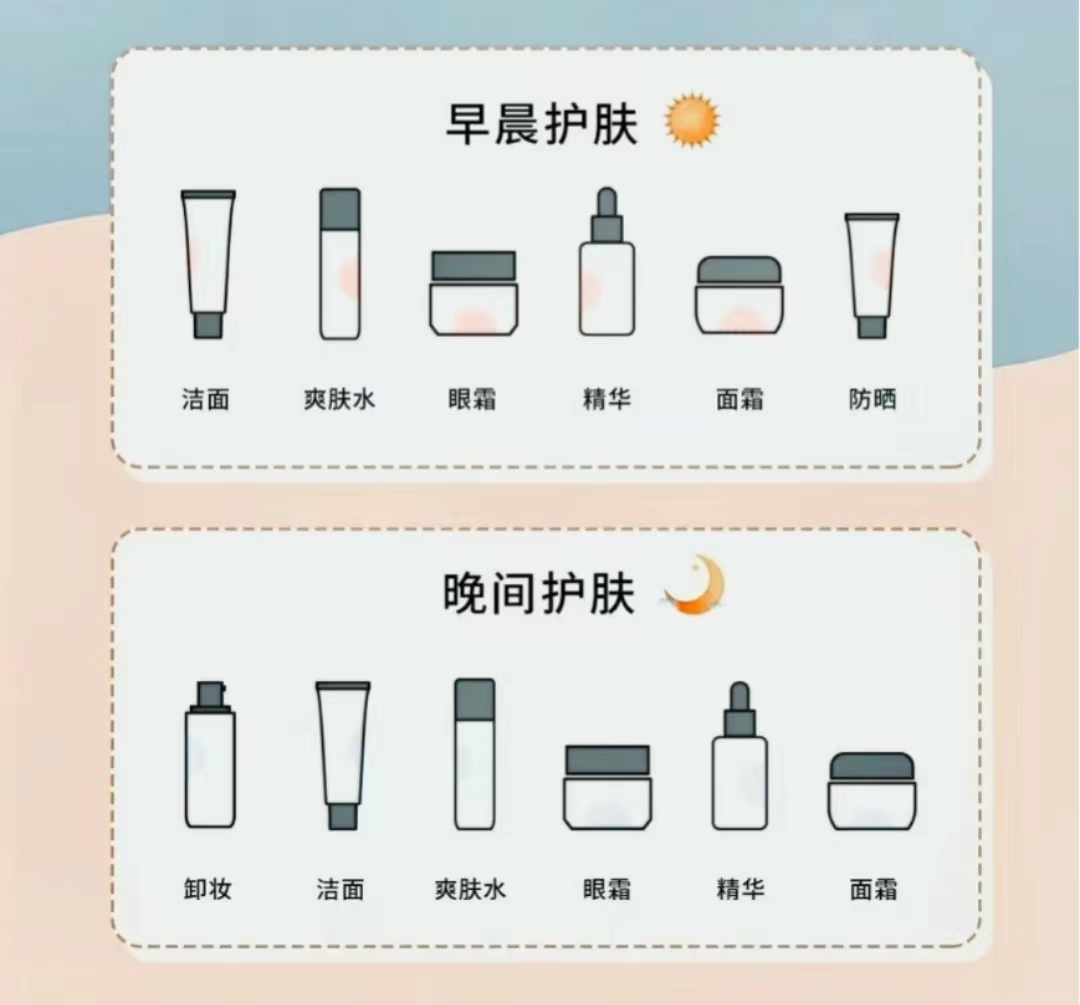 关于晚间护肤,我们就不需要使用隔离和防晒啦,具体护肤步骤如下图所示: