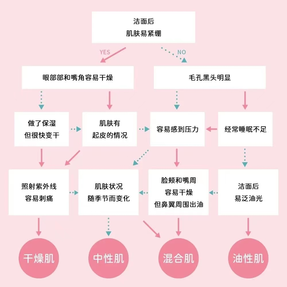 肌肤的含水量和皮脂量因人而异,而我们的皮肤通常可以分为“中性肌”、“敏感肌”、“油性肌”、“干性肌”4大类型,不同的肌肤类型如何来判断?最简单直观的方式是在洁面后根据肤感来决定: