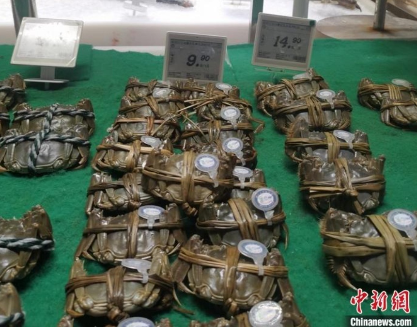 某超市售卖的山东东营大闸蟹。 中新网记者 谢艺观 摄