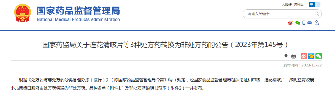 国家药监局近日发布公告,根据《处方药与非处方药分类管理办法(试行)》(原国家药品监督管理局令第10号)规定,经国家药监局组织论证和审核,连花清咳片、滋阴益胃胶囊、小儿芪楂口服液由处方药转换为非处方药。这也意味着,患者无须处方,即可购买和使用上述3种药品。