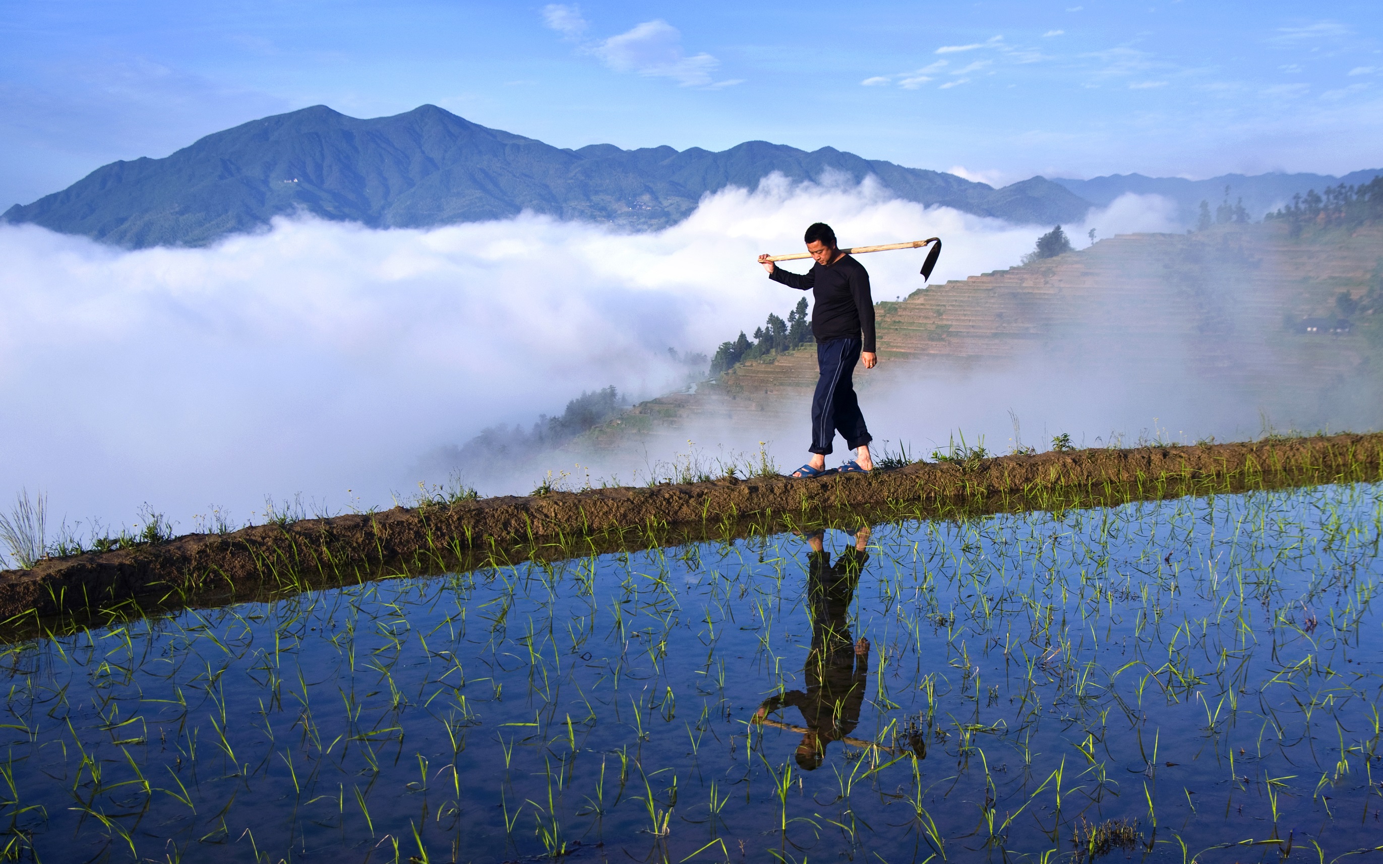 (农民行走在紫鹊界梯田上。罗中山 摄)