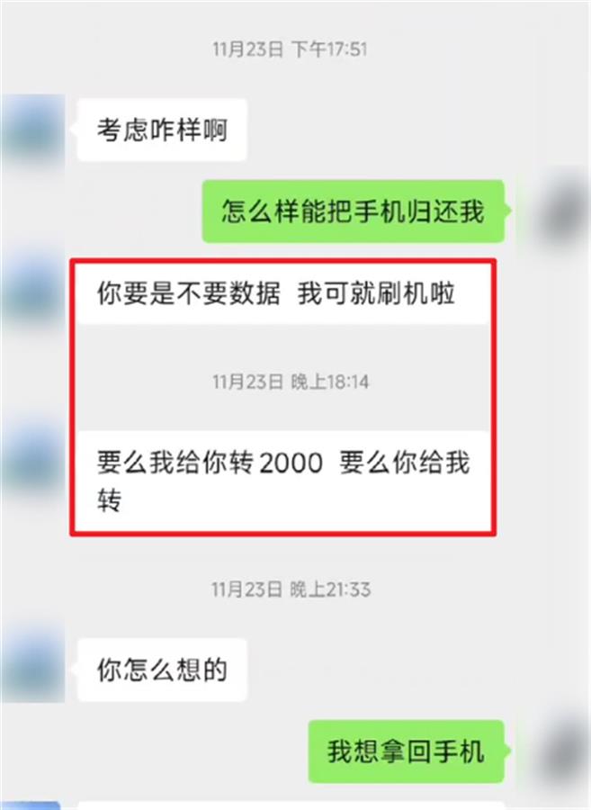 “我还是个学生,没有那么多钱。”张同学反复请求男子归还手机,但男子坚持要价2000元,其间甚至威胁如果不给钱就刷机。