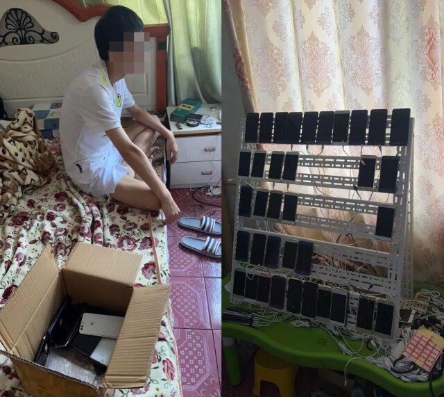 在其住处,手机被整整齐齐地码在床边架子上,以方便躺着就可以“养号”。