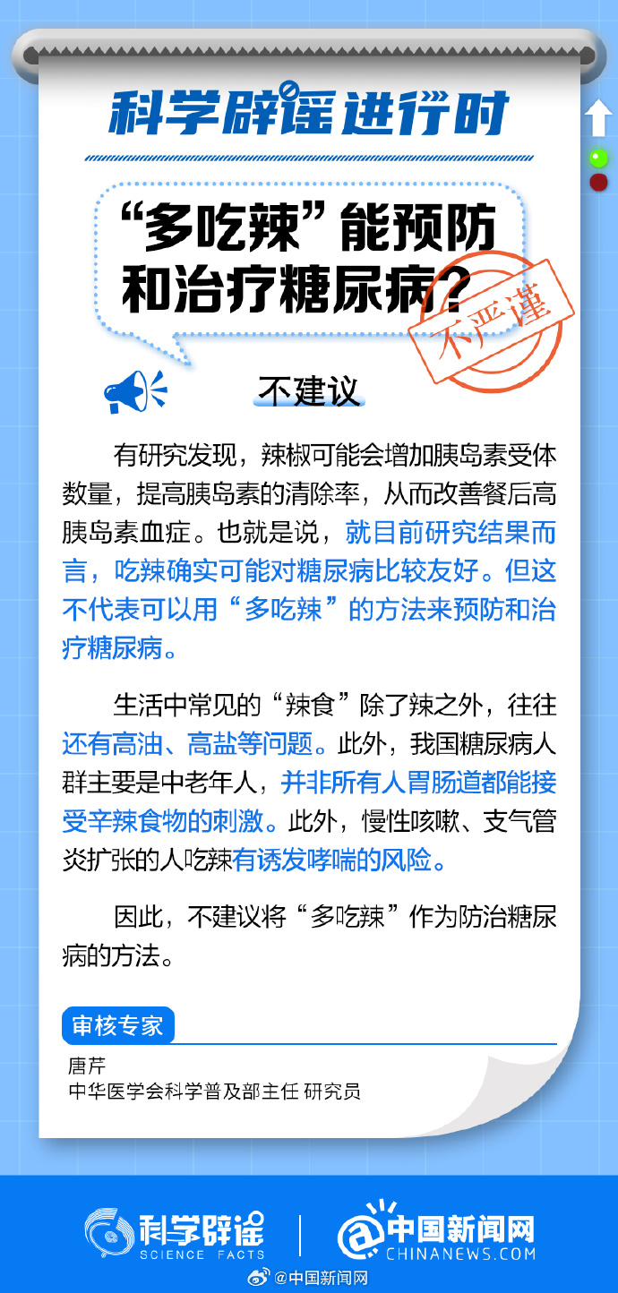 就目前研究结果而言,吃辣确实可能对糖尿病比较友好。但这不代表可以用“多吃辣”的方法来预防和治疗糖尿病。生活中常见的“辣食”除了辣之外,往往还有高油、高盐等问题。因此,不建议将“多吃辣”作为防治糖尿病的方法。(来源:@科学辟谣 @中国新闻网 )