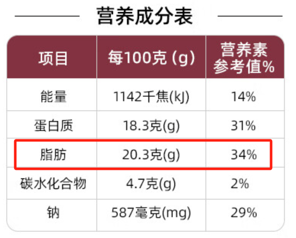 -可能会长胖:别小看了烤肠,它可是高能量高脂肪的食物。就比如下图这一款电商平台卖得还挺火的某品牌烤肠的营养成分表,脂肪含量高达 20.3g/100g,是猪瘦肉的 3 倍多,热量为 273kcal/100g,吃 1 根烤肠(约 50g),摄入的热量可不低,相当于 1 小碗蒸米饭呢,得跑步 20 分钟才能消耗掉。