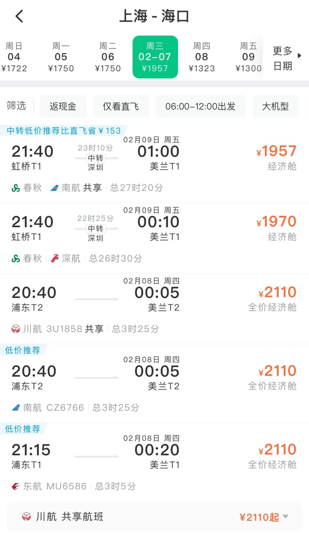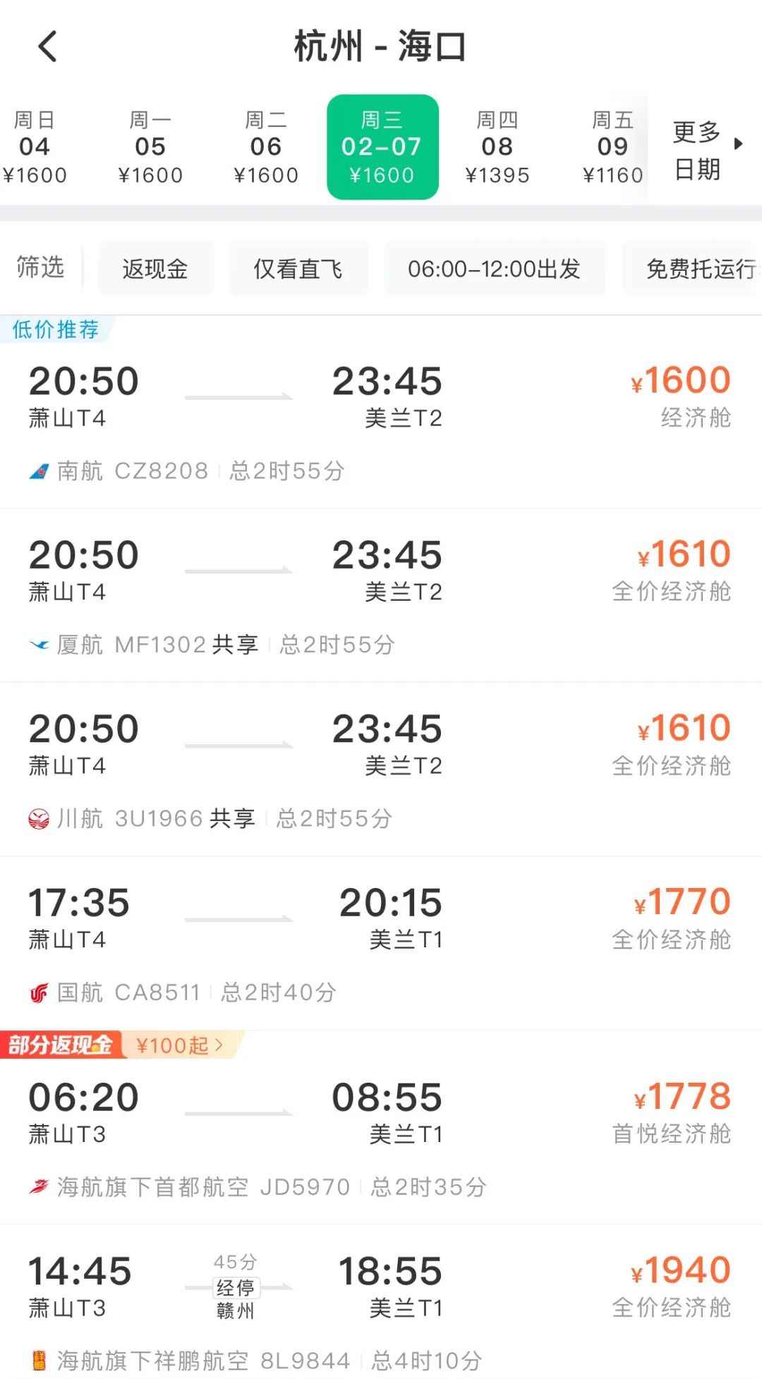 到2月7日、8日,也就是腊月廿八、廿九,由于临近春节长假,杭州、衢州、上海飞海口航线经济舱票价普遍逼近2000元,甚至更高。