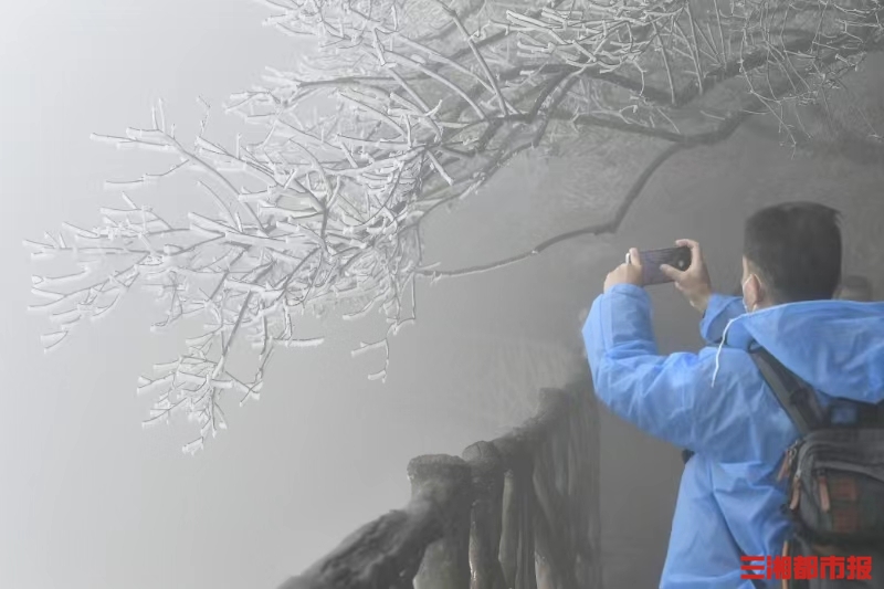 “周末在张家界天门山看到今年冬天的第一场雪,想起诗句‘不知天上谁横笛,吹落琼花满世间。’雪落人间,姿态万千,搭配天门山奇景,这景令人喜悦又痴迷。”酷爱登山的“00后”、长沙理工大学大四学生陈遥说。