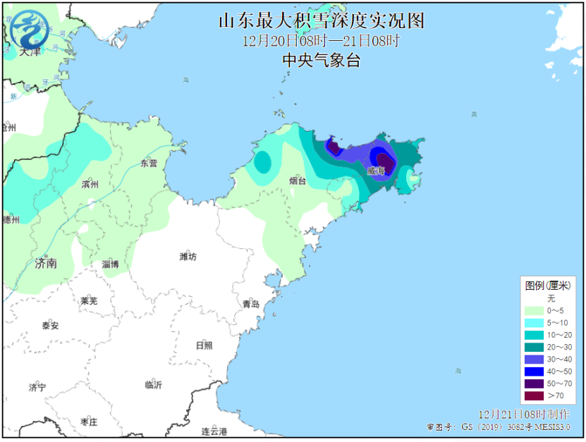 12月以来,山东半岛已经出现多场冷流降雪,“雪窝子”果然不是浪得虚名。监测显示,20日8时至21日8时,烟台积雪达52厘米、文登55厘米。其中,文登打破了2005年12月13日积雪54厘米的纪录。